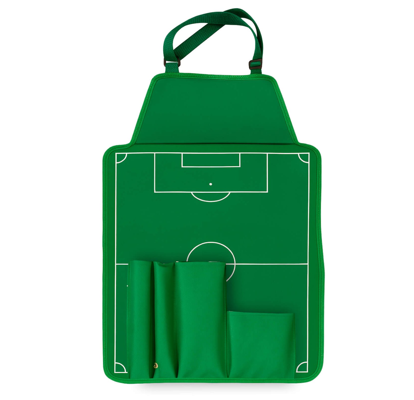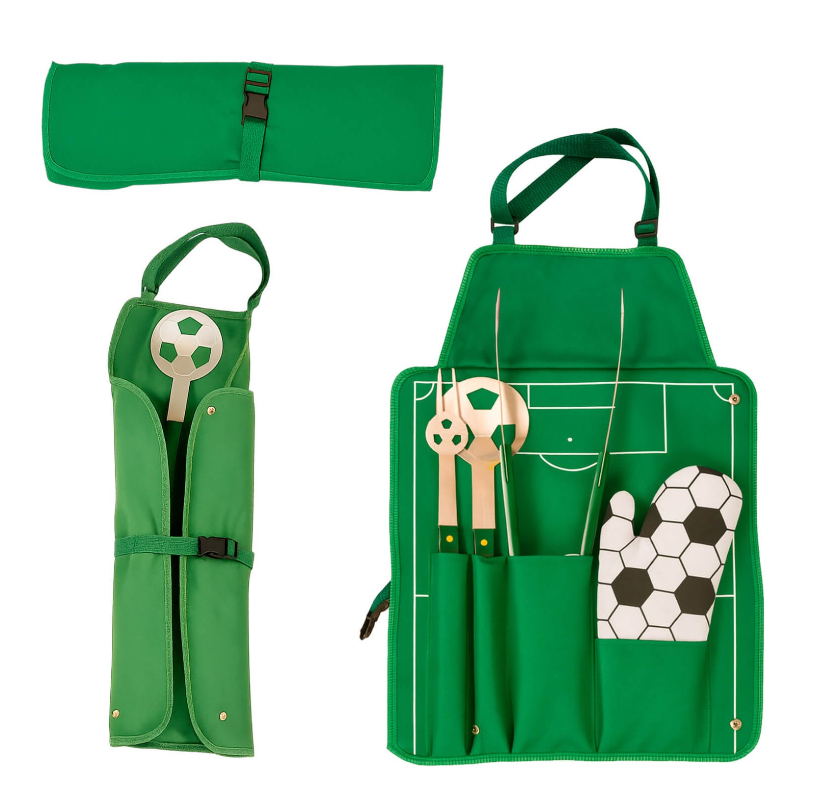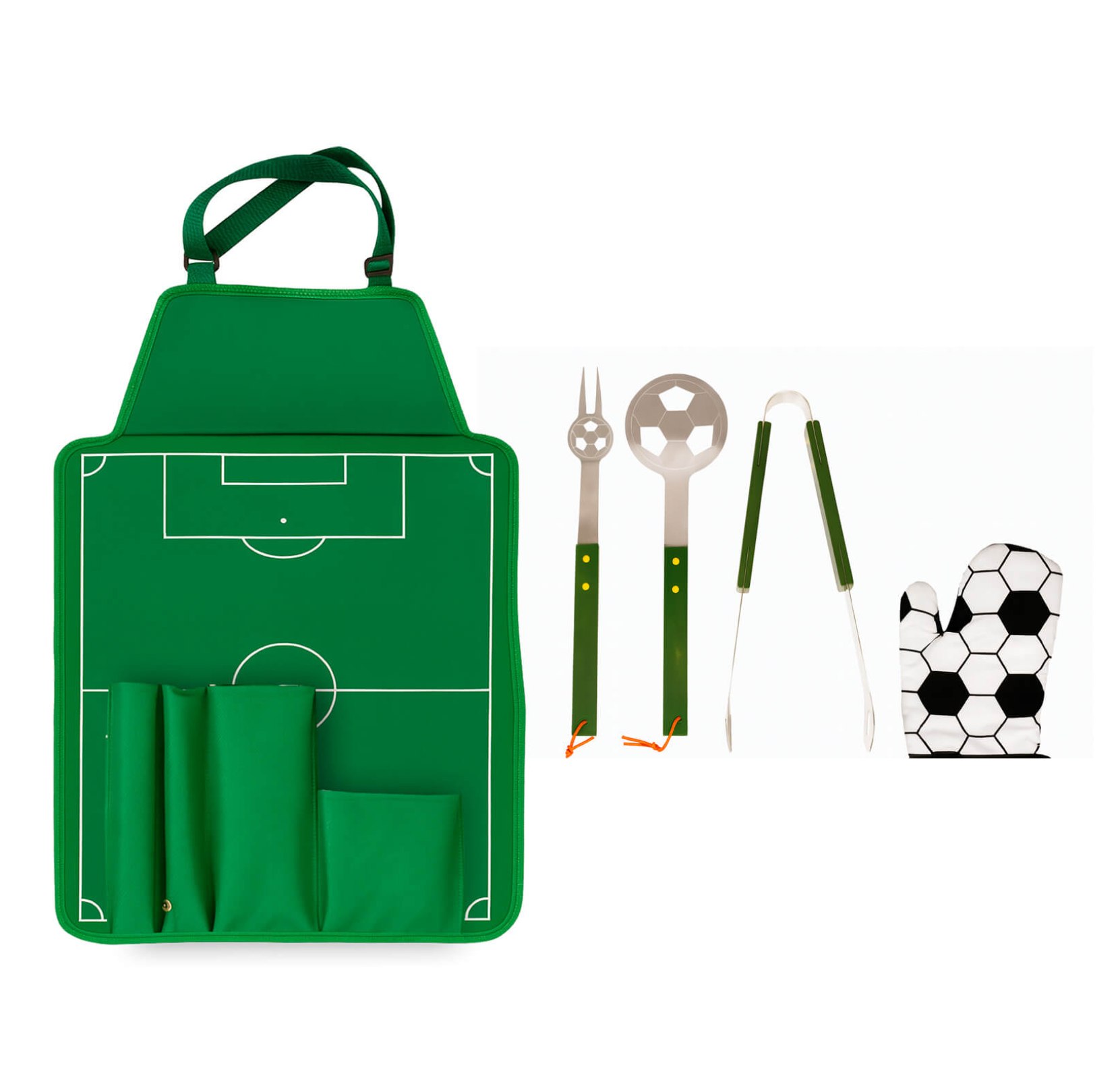 Set de BBQ en estuche con diseño de cancha de fútbol que también funciona como mandil. Incluye guante, pinzas, tenedor asador y volteador.