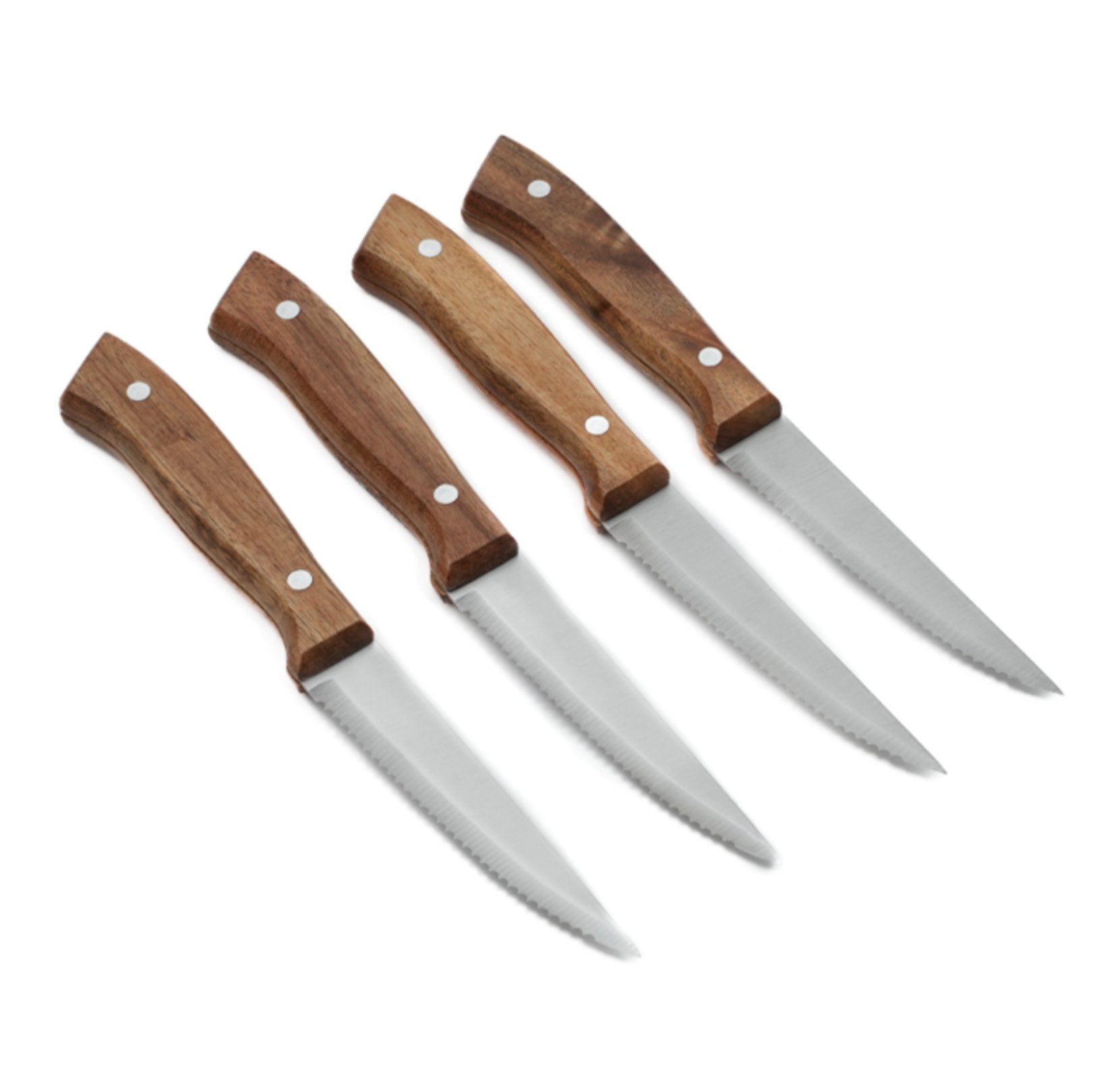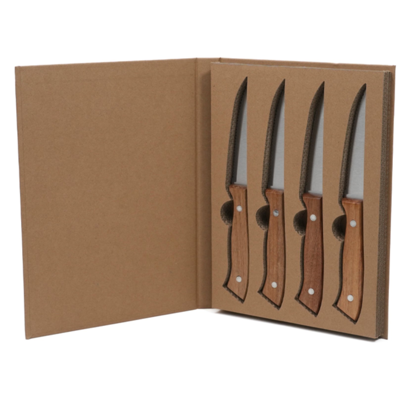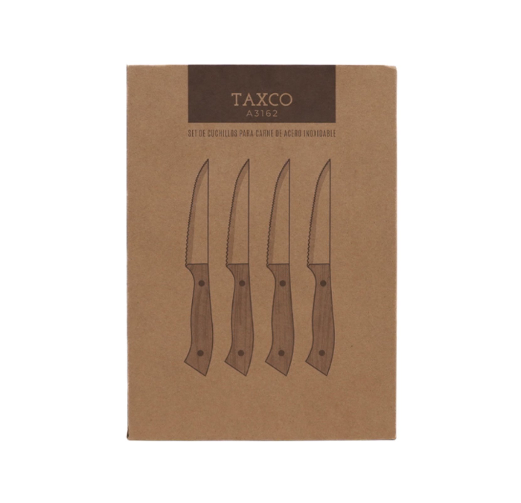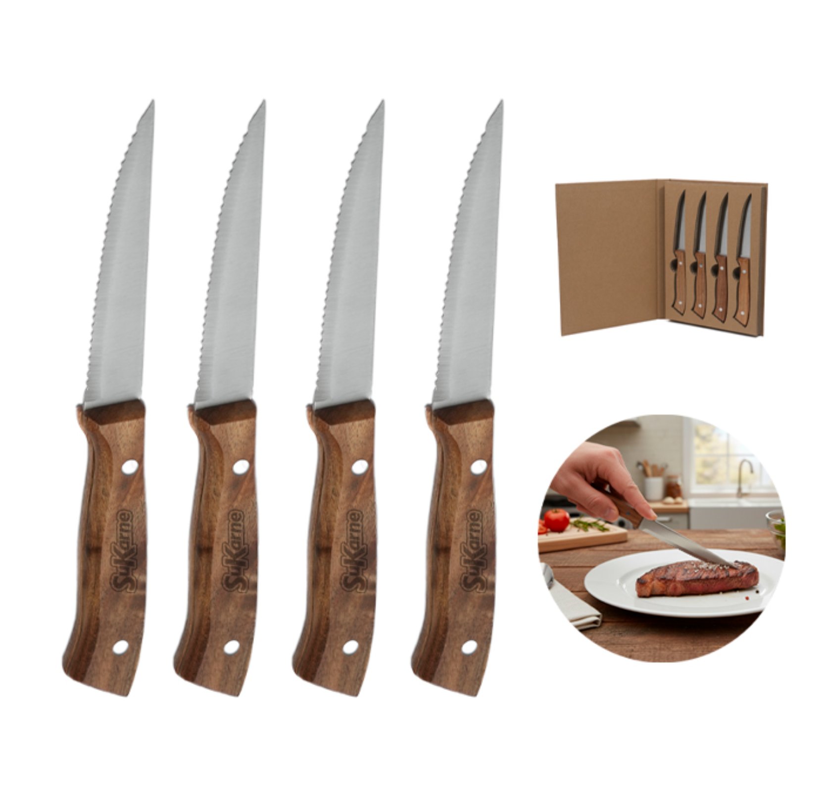 Este set incluye cuatro cuchillos organizados en una presentación individual que facilita su almacenamiento y protección. Es ideal tanto para uso doméstico como para reuniones o parrilladas donde se requiere un corte preciso.