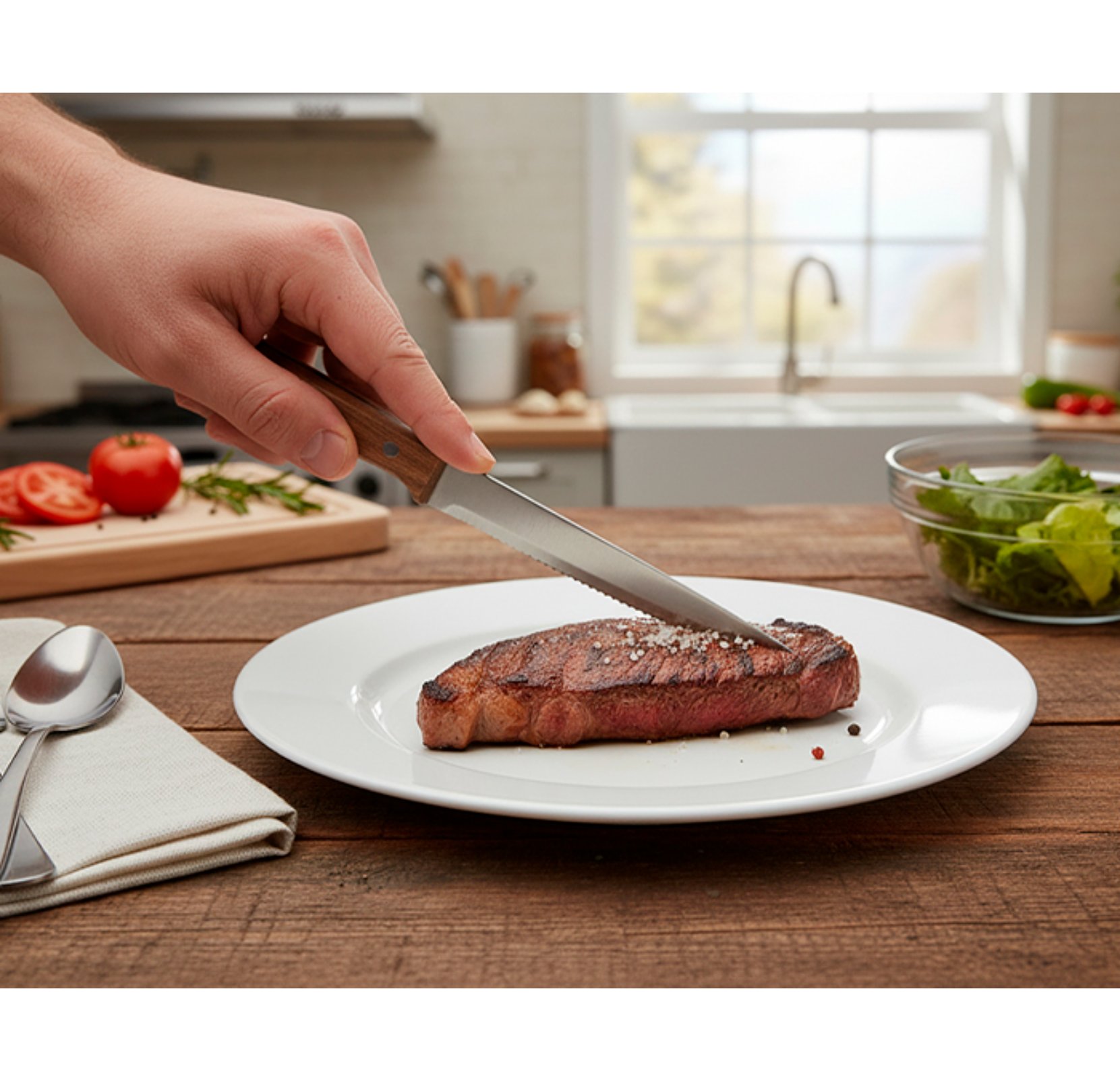 Los mangos de madera de acacia brindan un agarre cómodo, seguro y ergonómico, permitiendo un mejor control durante el corte. Su diseño combina estética y funcionalidad, aportando un toque natural y elegante a la mesa o área de cocina.