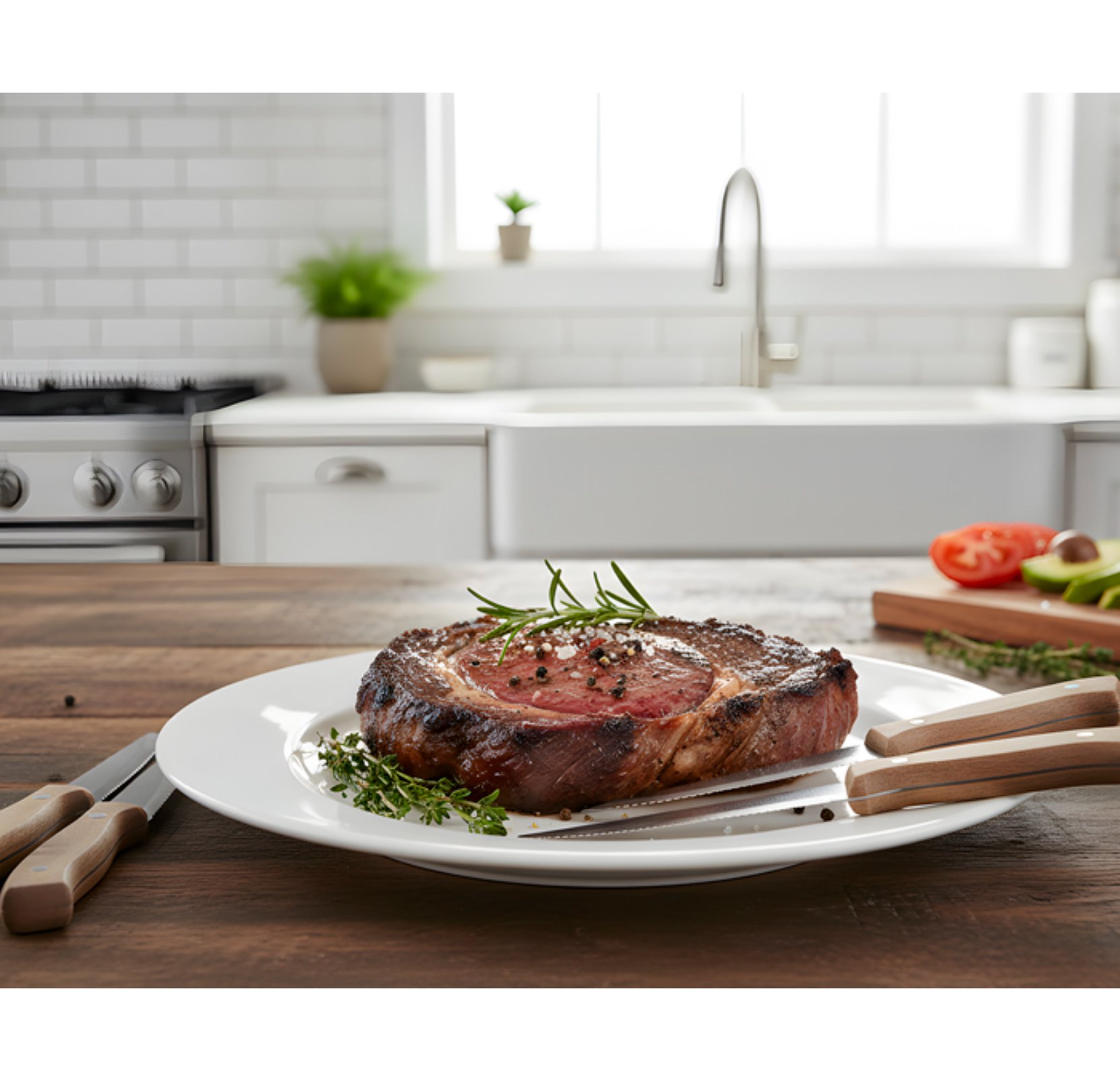 El set de cuchillos para carne está diseñado para ofrecer cortes precisos y eficientes en todo tipo de carnes, facilitando la preparación y el servicio de alimentos. Sus hojas de acero inoxidable proporcionan un filo duradero, resistente a la corrosión y adecuado para un uso constante en cocina.