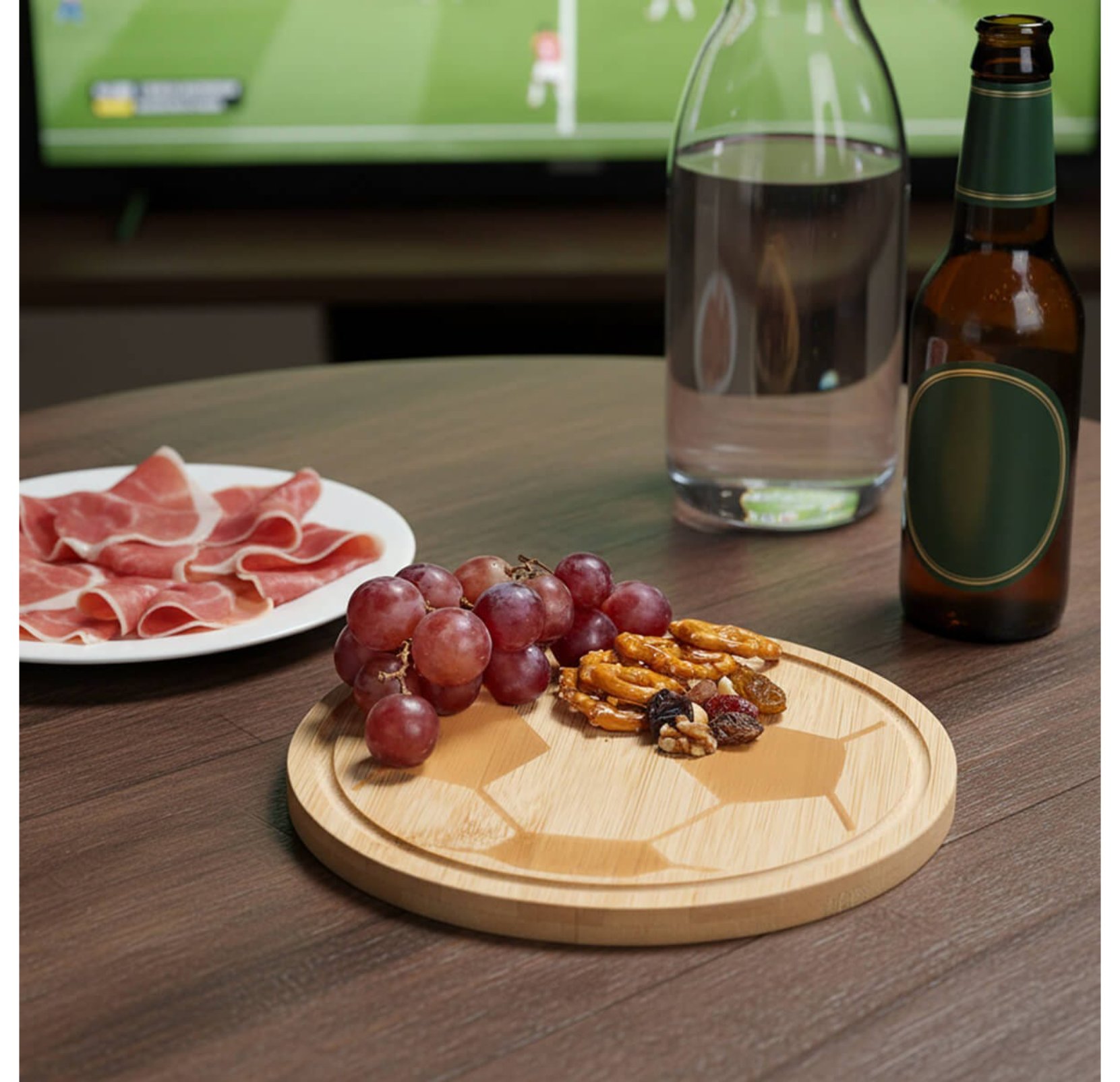 Su diseño en forma de balón de fútbol la convierte en una pieza única que aporta un toque decorativo a cualquier espacio. Es ideal para presentar botanas, quesos o snacks en reuniones, logrando una presentación atractiva y diferente. Además, cuenta con un bisel interior que ayuda a evitar derrames, brindando mayor practicidad durante su uso.