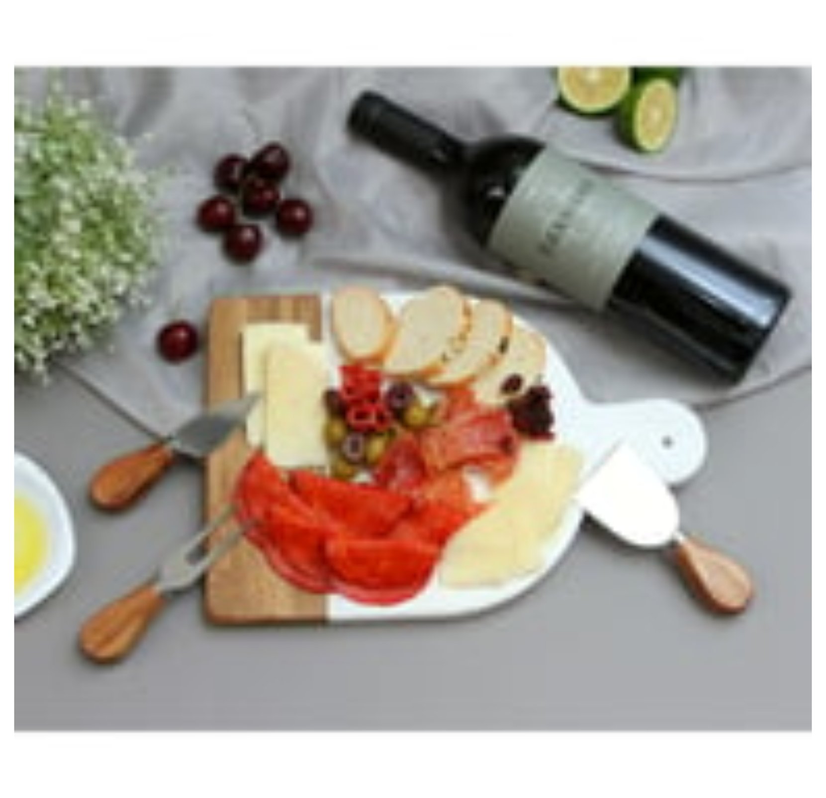 Incluye cuchillo, trinche y espátula, permitiendo presentar diferentes tipos de quesos o aperitivos de manera organizada. Su diseño funcional facilita el corte y servicio, siendo ideal para reuniones o eventos.
