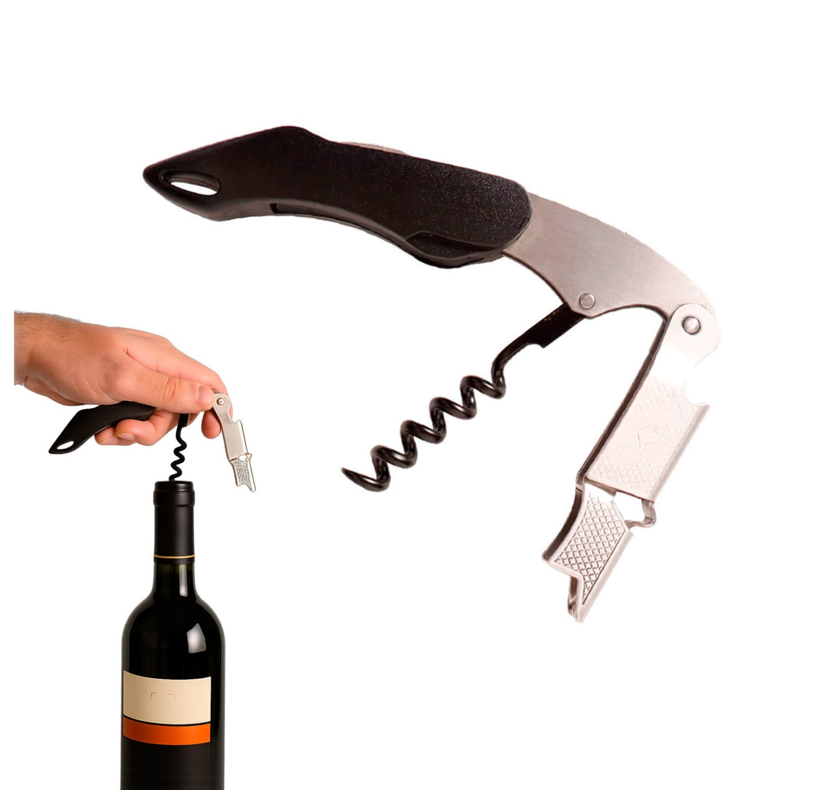 Fabricado en acero inoxidable de alta resistencia, este sacacorchos ofrece una larga vida útil, soportando el uso constante sin perder funcionalidad. Su diseño incluye un mango reforzado que proporciona un agarre firme y ergonómico, facilitando su manipulación incluso para usuarios sin experiencia.