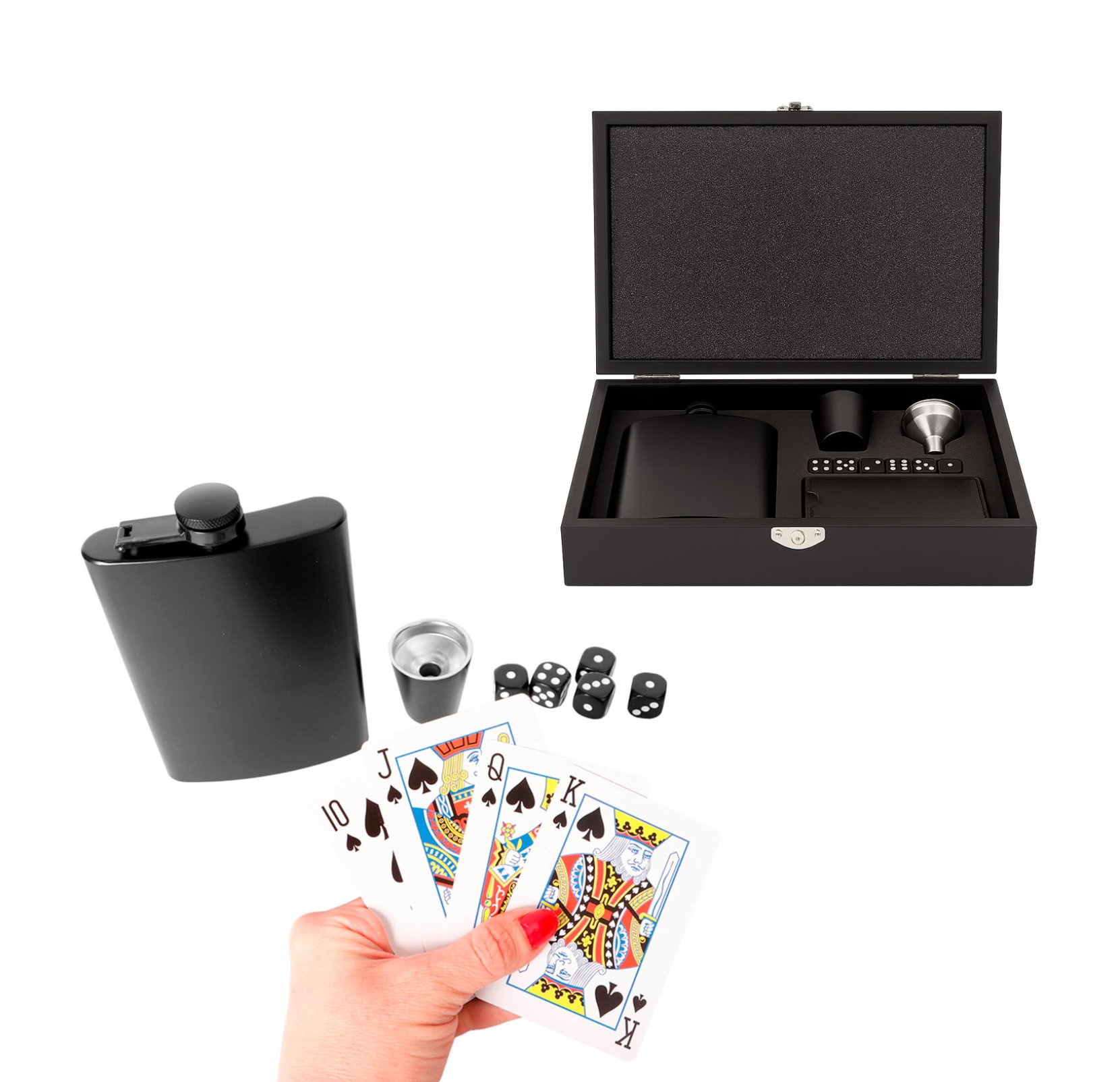 El set de licorera es una opción completa para quienes buscan disfrutar bebidas con estilo y practicidad. Incluye licorera, shot, mini embudo, dados y juego de cartas, ofreciendo una experiencia completa en un solo conjunto.