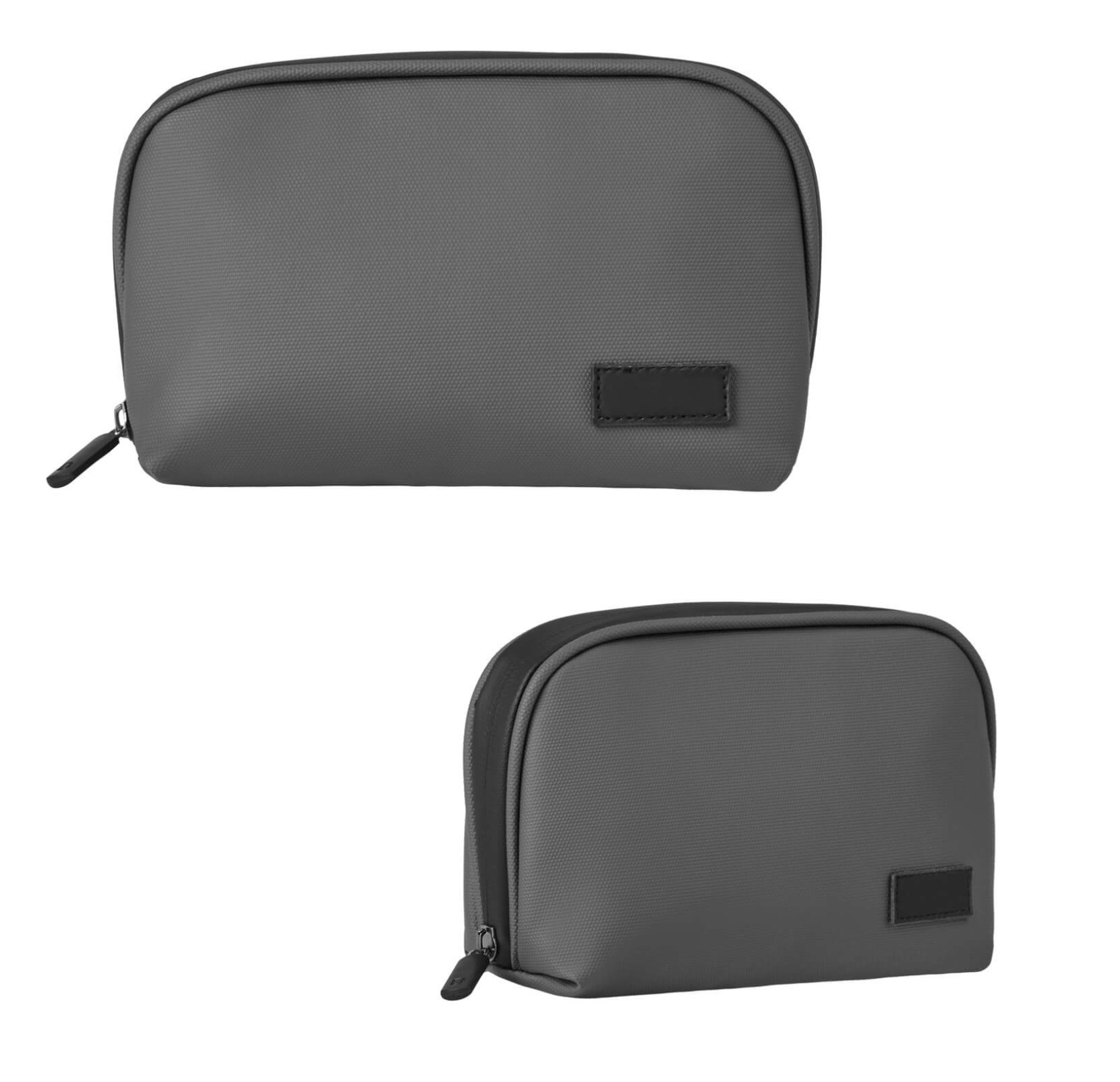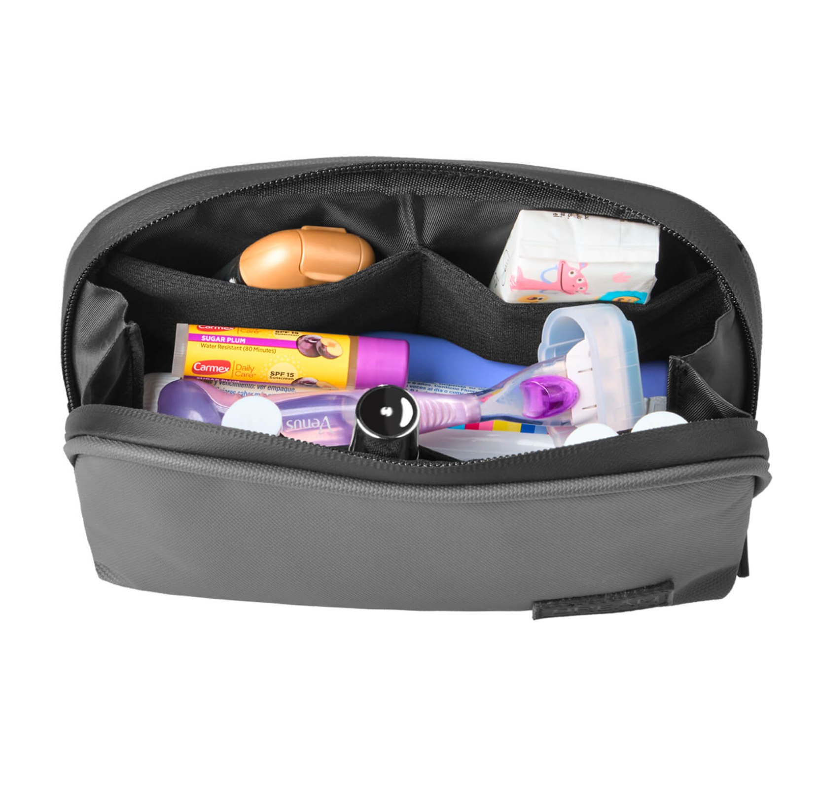 Neceser de viaje con interior forrado, cinco compartimentos y cierre.