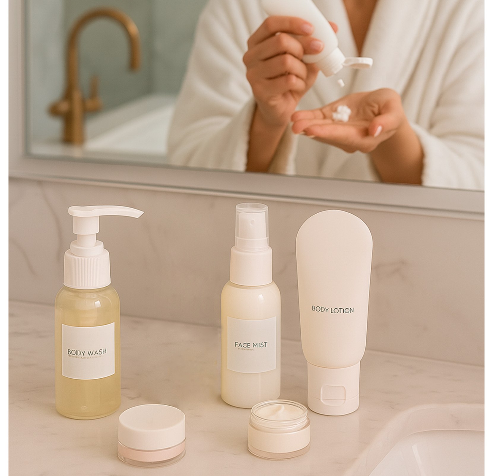 Set de viaje con 8 accesorios: 1 atomizador, 1 bote con dispensador, 2 botes con tapa Disc Top, 1 bote, 1 recipiente para almacenamiento, 1 mini embudo y 1 palita. Incluye estuche.
