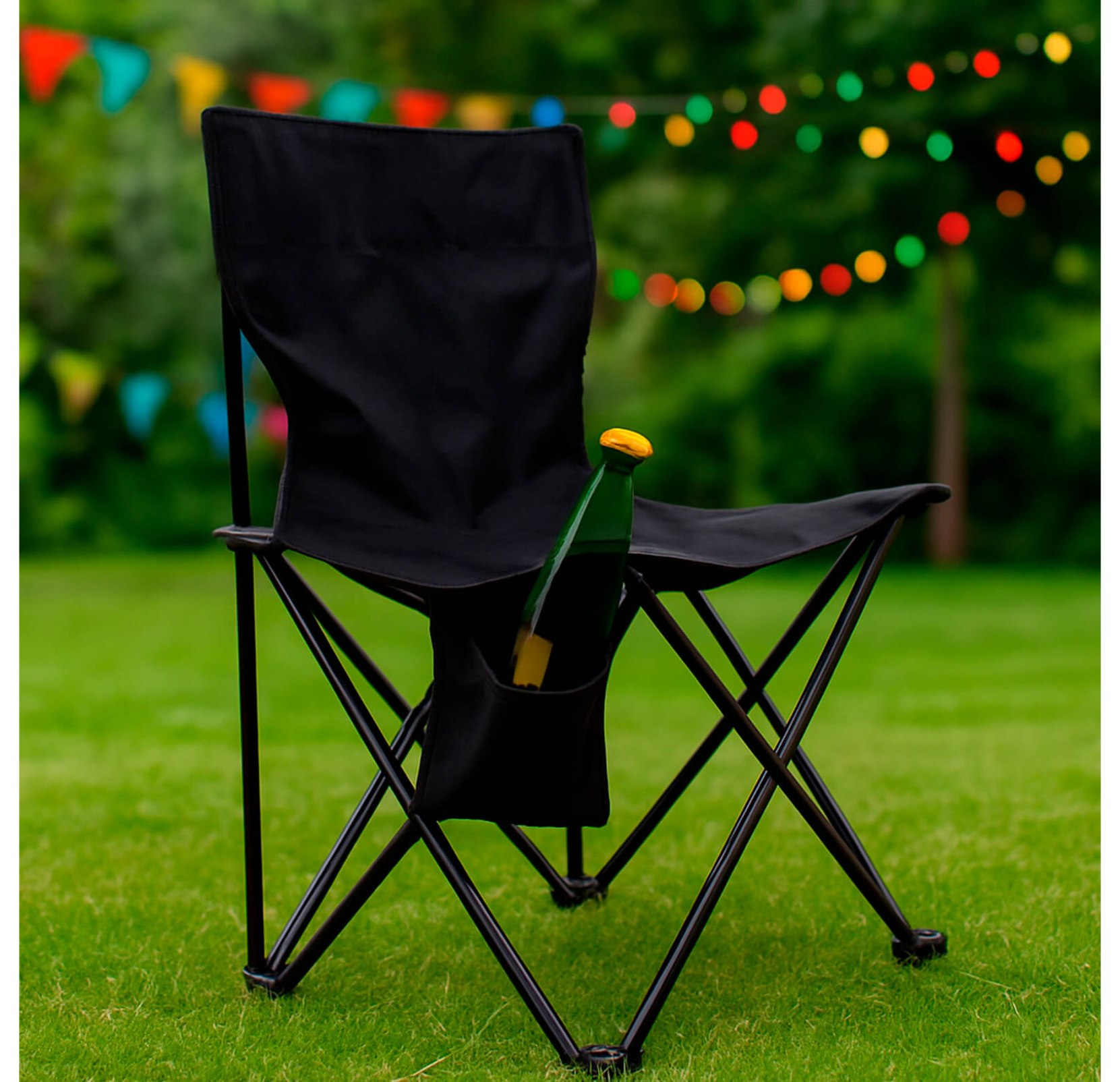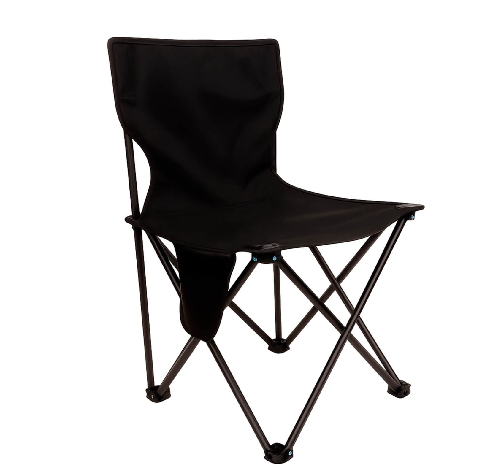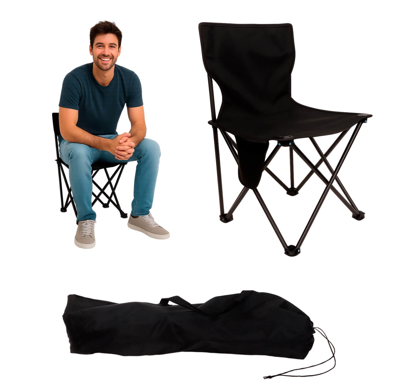 Mini silla portátil plegable de metal con asiento y respaldo de poliéster. Incluye funda con asa y correa ajustable.