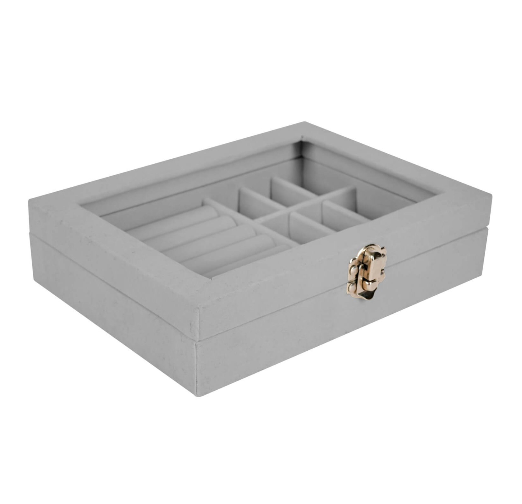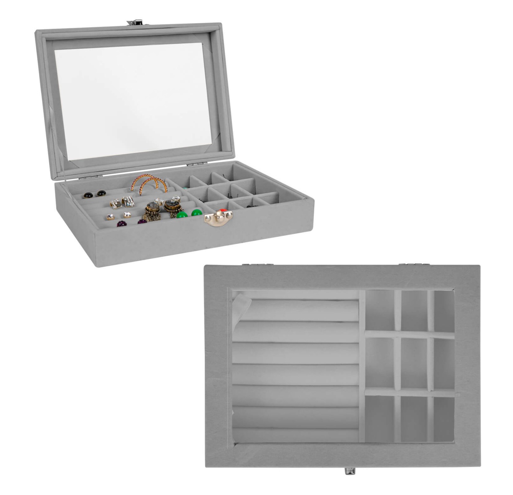 Organizador de joyas de gamuza que cuenta con 9 espacios ajustables y 6 espacios largos para anillos.