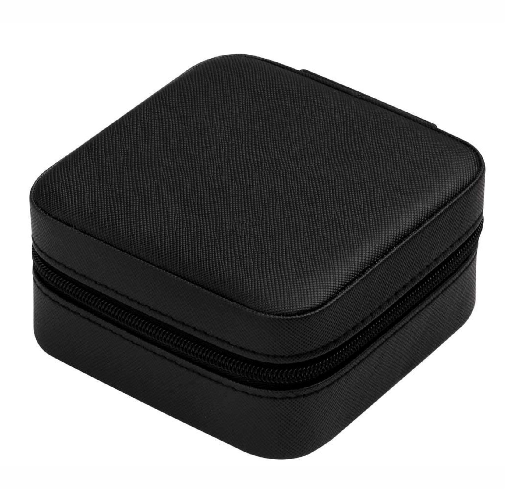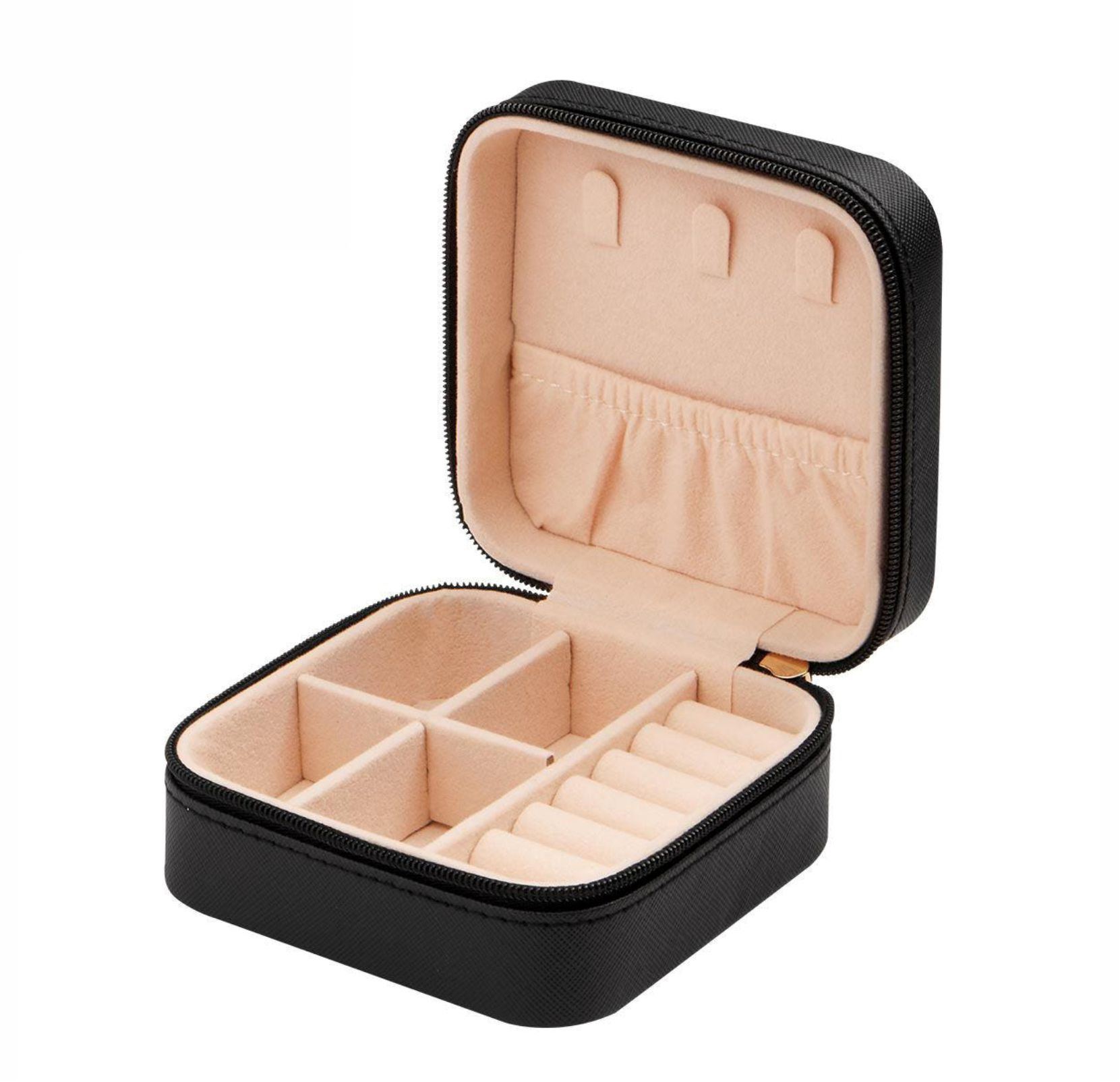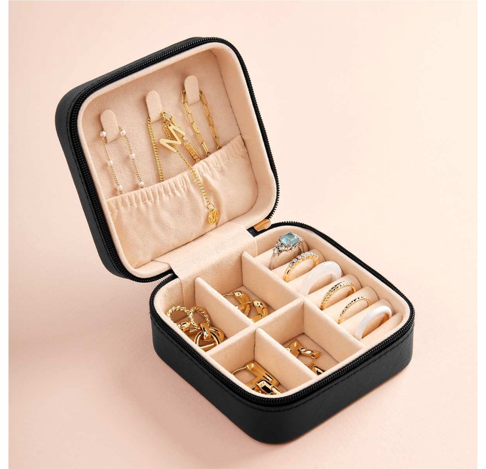 Alhajero con compartimento principal con cierre. Interior tipo terciopelo que protege la joyería de rayones y daños. Incluye 3 ganchos para collares, 6 ranuras para anillos, 1 bolsillo interior con elástico y 4 divisiones.