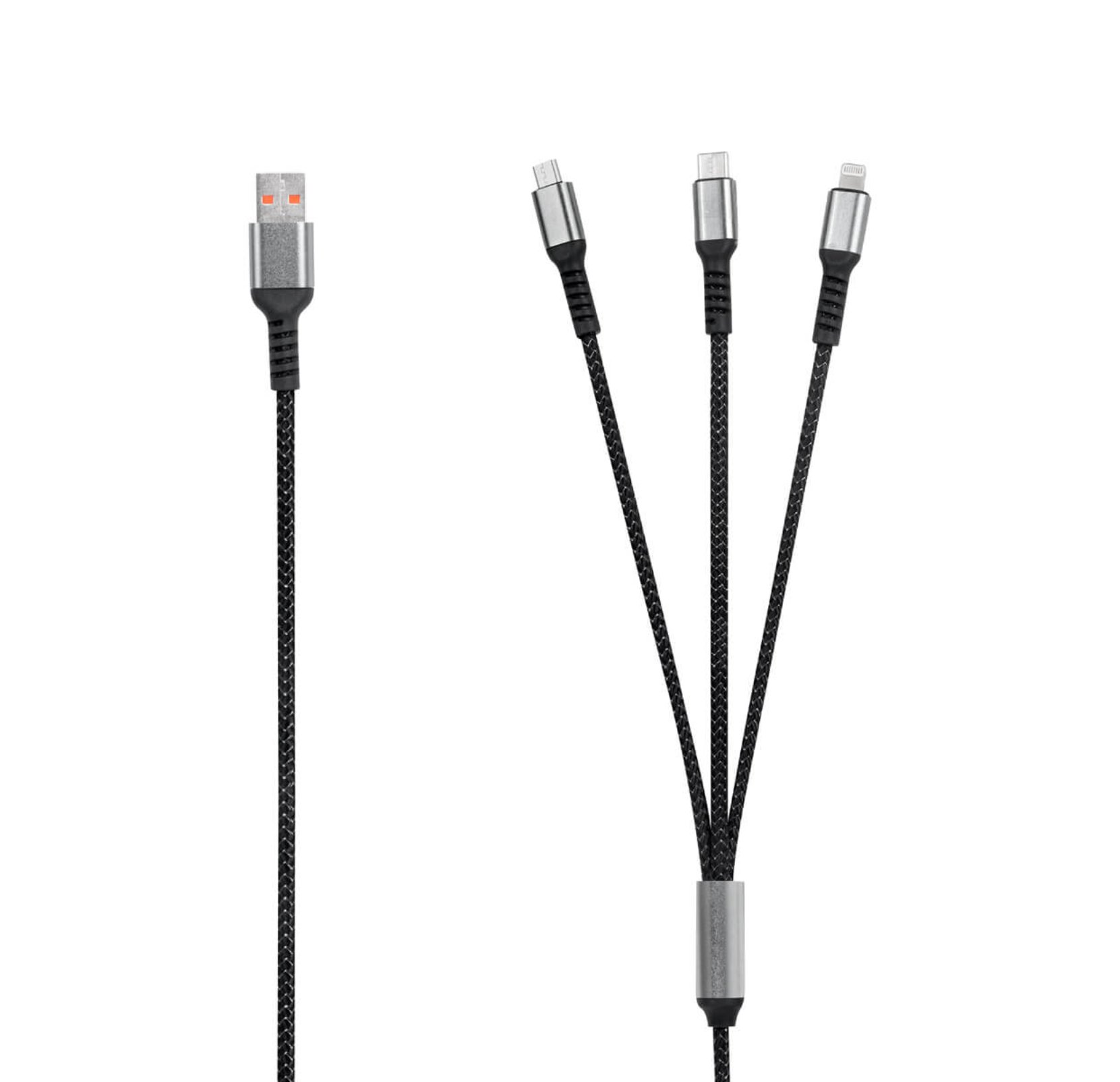 El Cable Zaru es un accesorio versátil y resistente diseñado para cargar y sincronizar múltiples dispositivos desde una sola fuente. Su sistema 3 en 1 incluye conectores Tipo C, Lightning y Micro USB, lo que garantiza compatibilidad con teléfonos, tablets, audífonos y diversos gadgets. Además de permitir transferencia de datos, su diseño trenzado evita enredos y nudos, ofreciendo mayor durabilidad y comodidad para uso diario en oficina, casa o viajes. Con un largo de 1.2 metros y acabados en plástico y metal, es un cable confiable, moderno y perfecto como artículo promocional tecnológico.