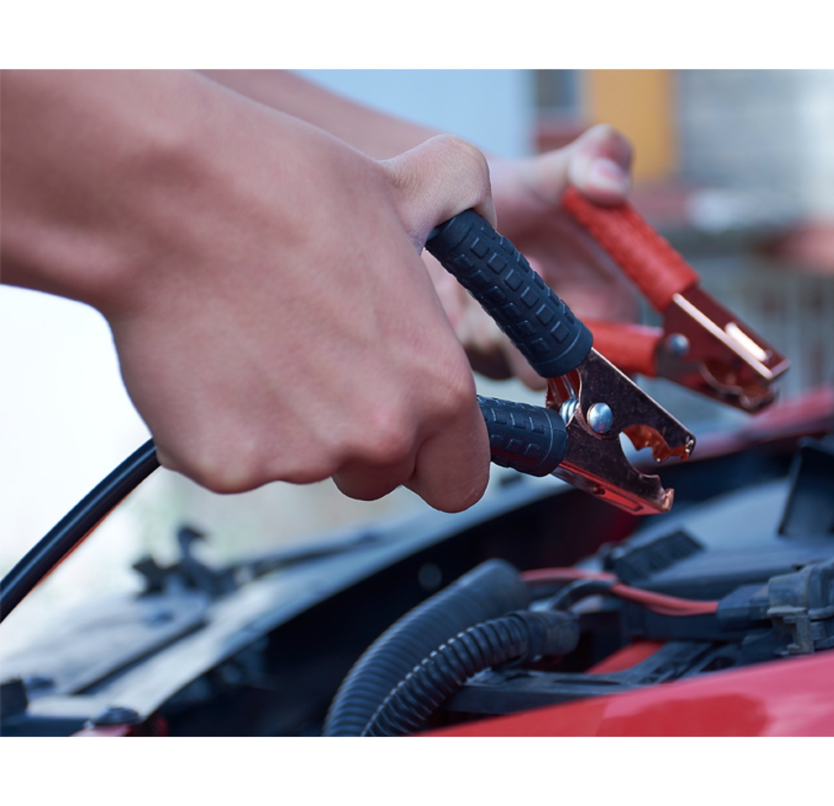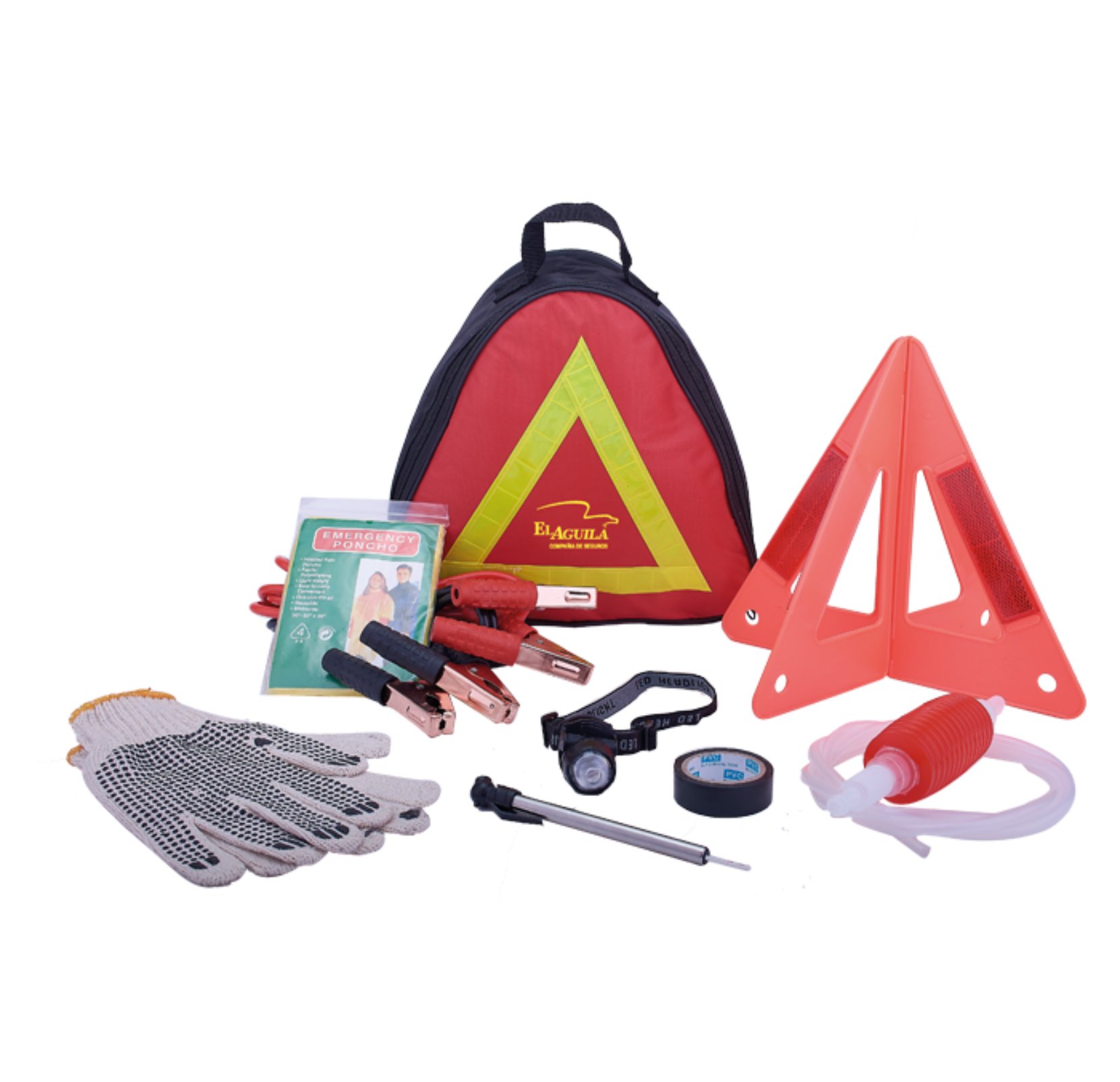 Kit de emergencia para automovilista que contiene: manguera y bomba manual de gasolina, juego de cables pasa corriente de 24 volts, linterna tipo minero con luz LED (utiliza 2 baterías tipo botón incluidas), cinta de aislar, triángulo reflejante de señalización, guantes antiderrapantes, impermeable y calibrador de presión de llantas. Incluye estuche tipo mochila, el cual tiene impreso un triángulo de señalización fosforescente. Presentación: caja en color blanco.