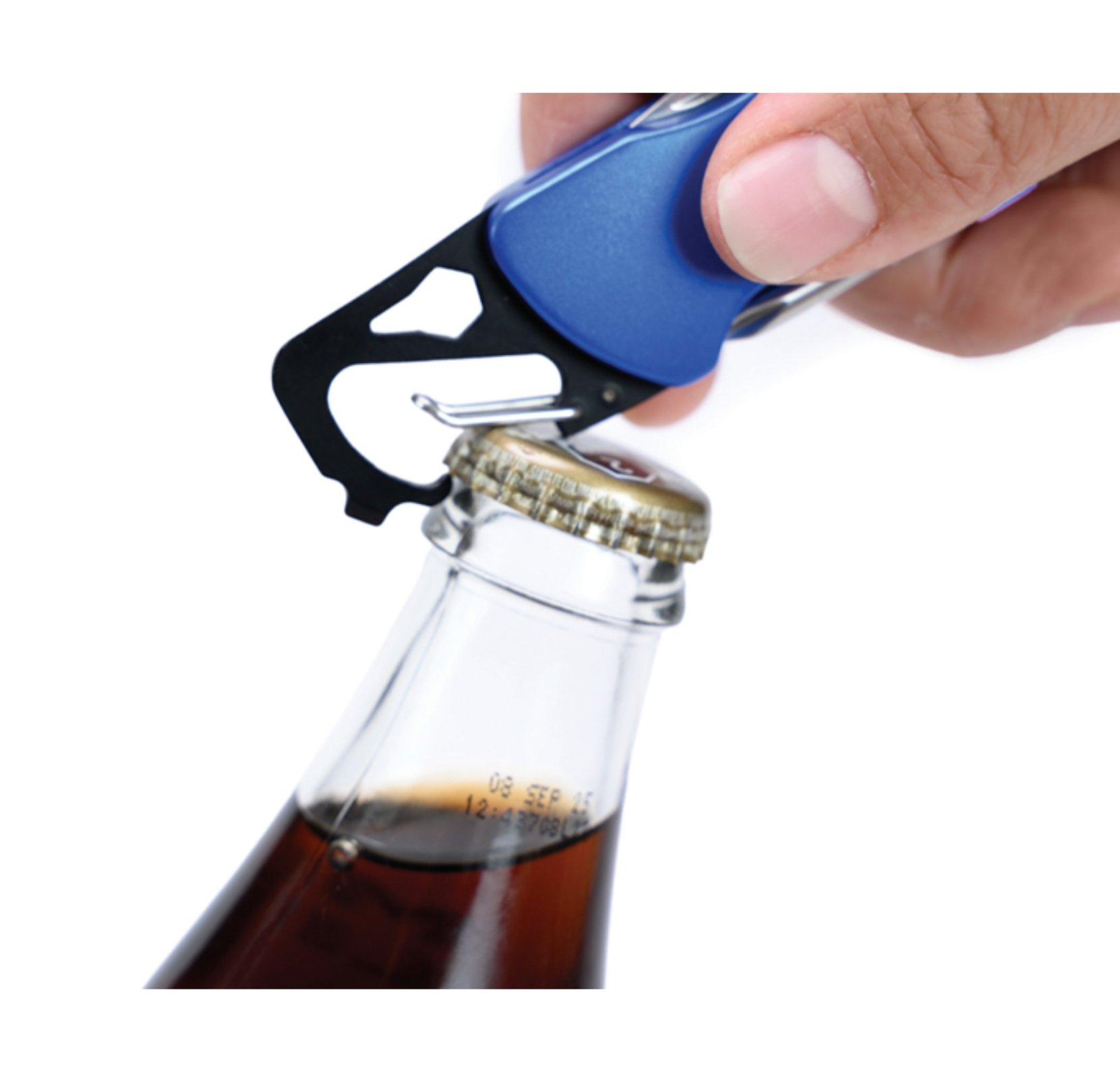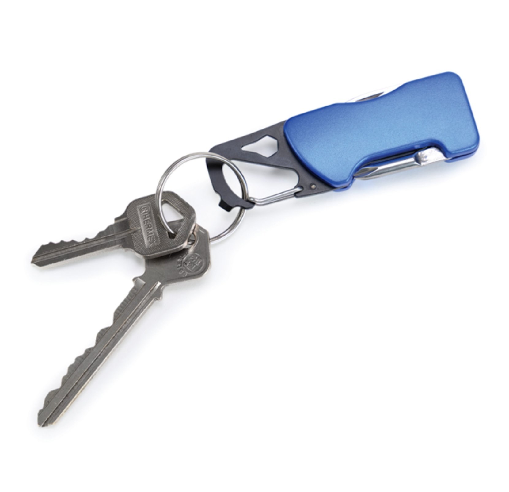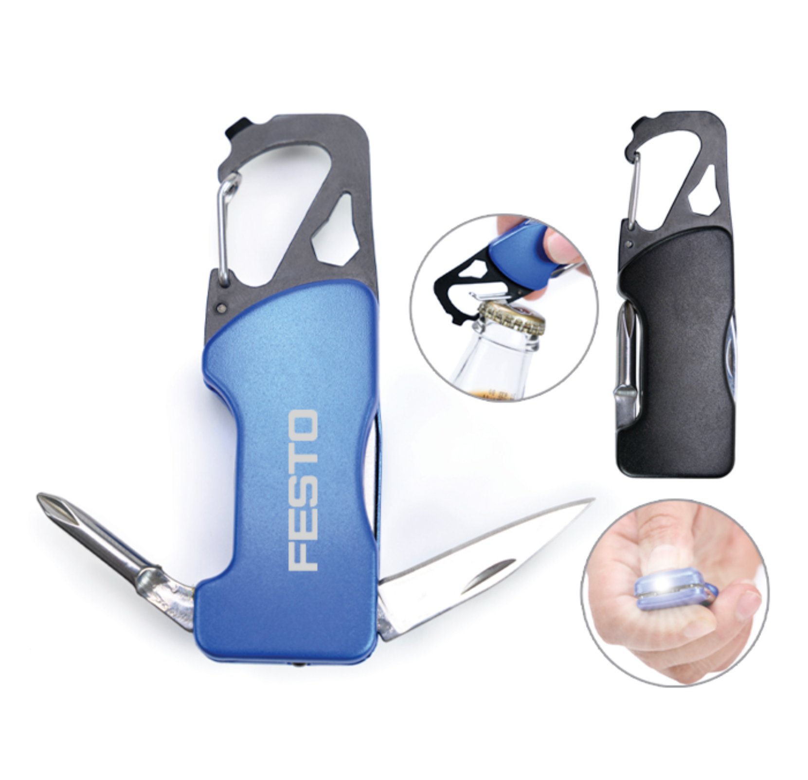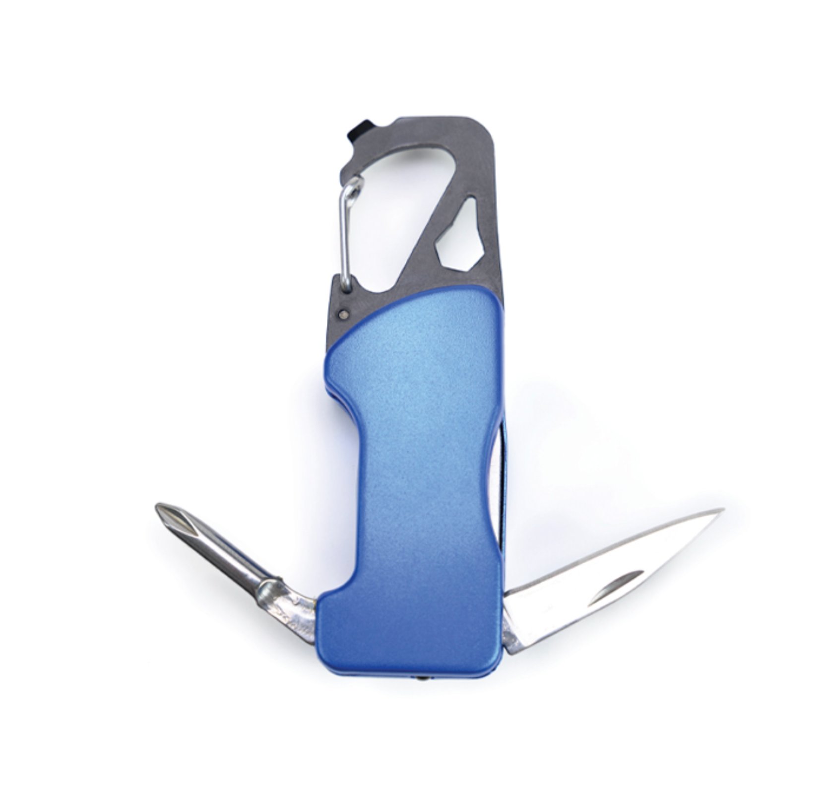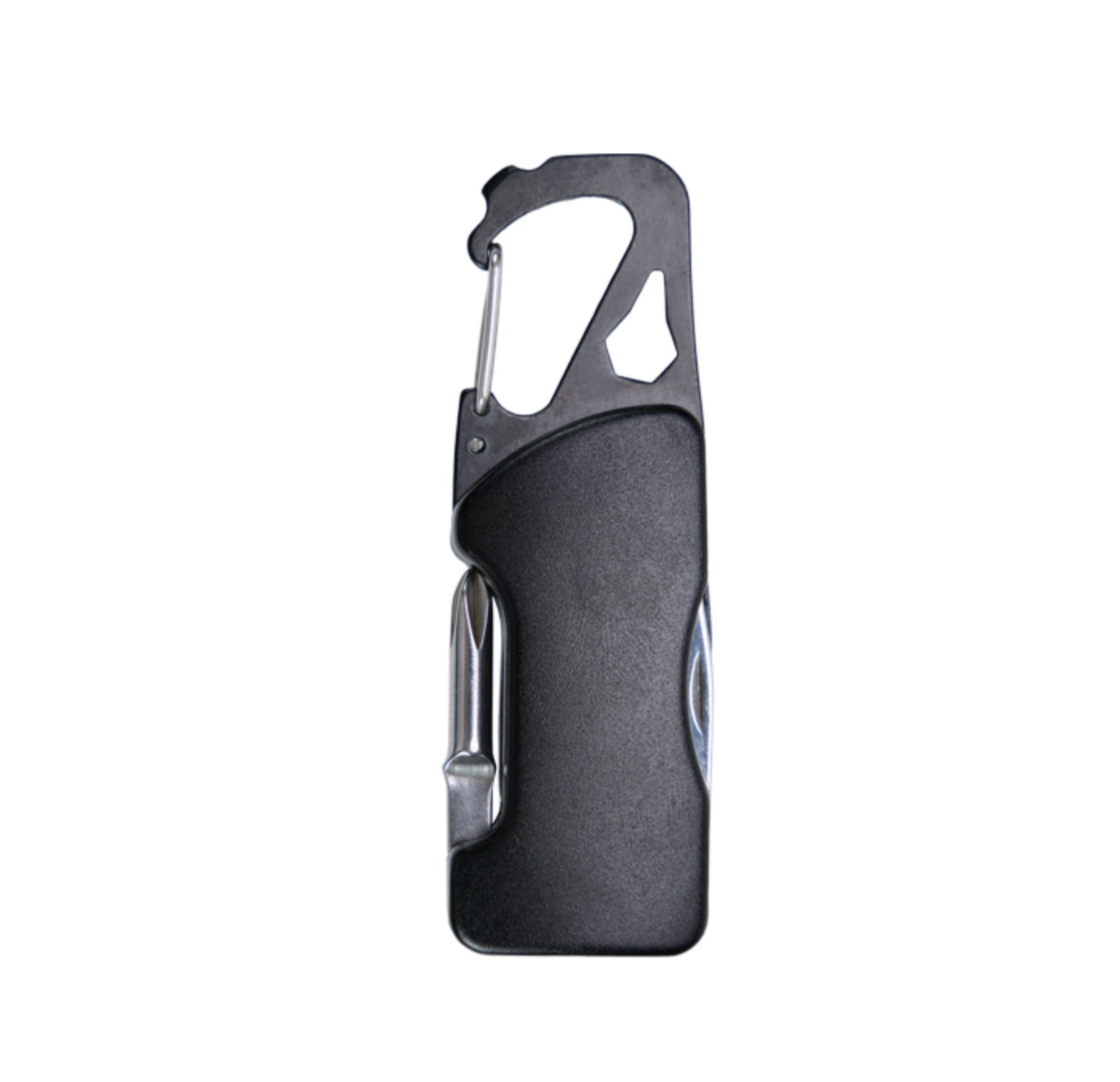 Gancho con clip multifunción que incluye: Luz LED con botón de encendido/apagado, navaja, destapador, llave allen, mini desarmador plano y desarmador de cruz. Incluye 2 baterías de botón. Presentación: caja individual de kraft.