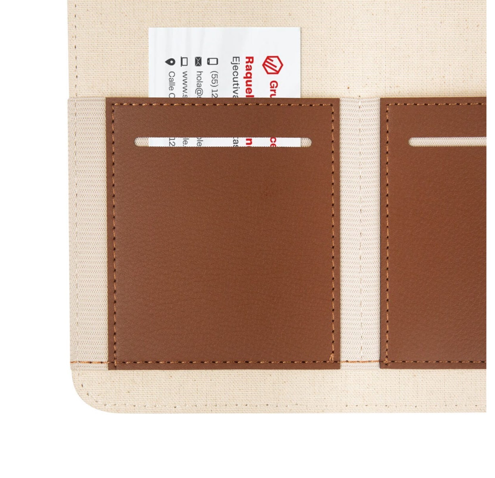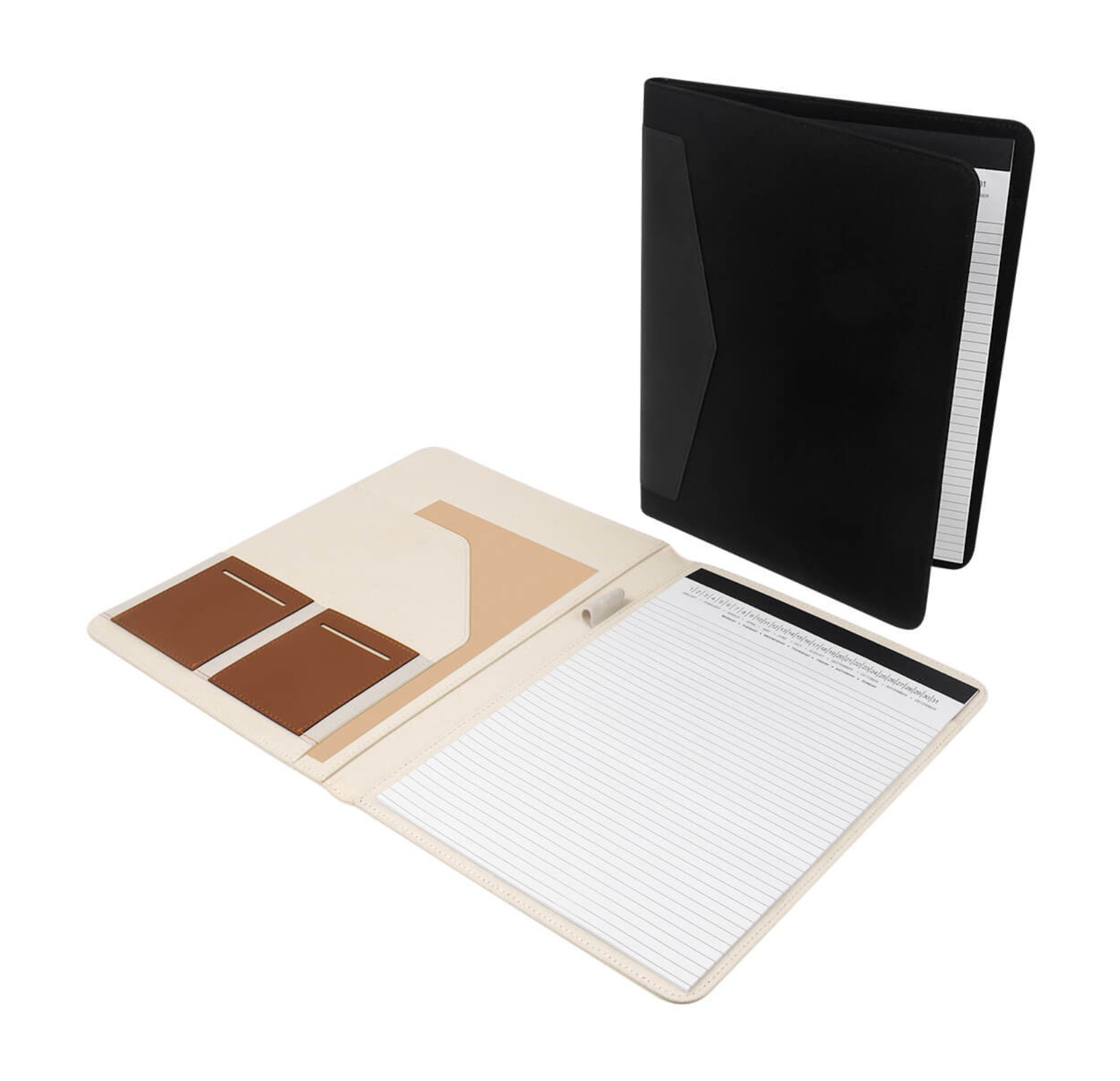 Carpeta con compartimentos para hojas y tarjetas. Incluye un block de raya tamaño A4 con 20 hojas y un elástico para sujetar un bolígrafo. No incluye bolígrafo.