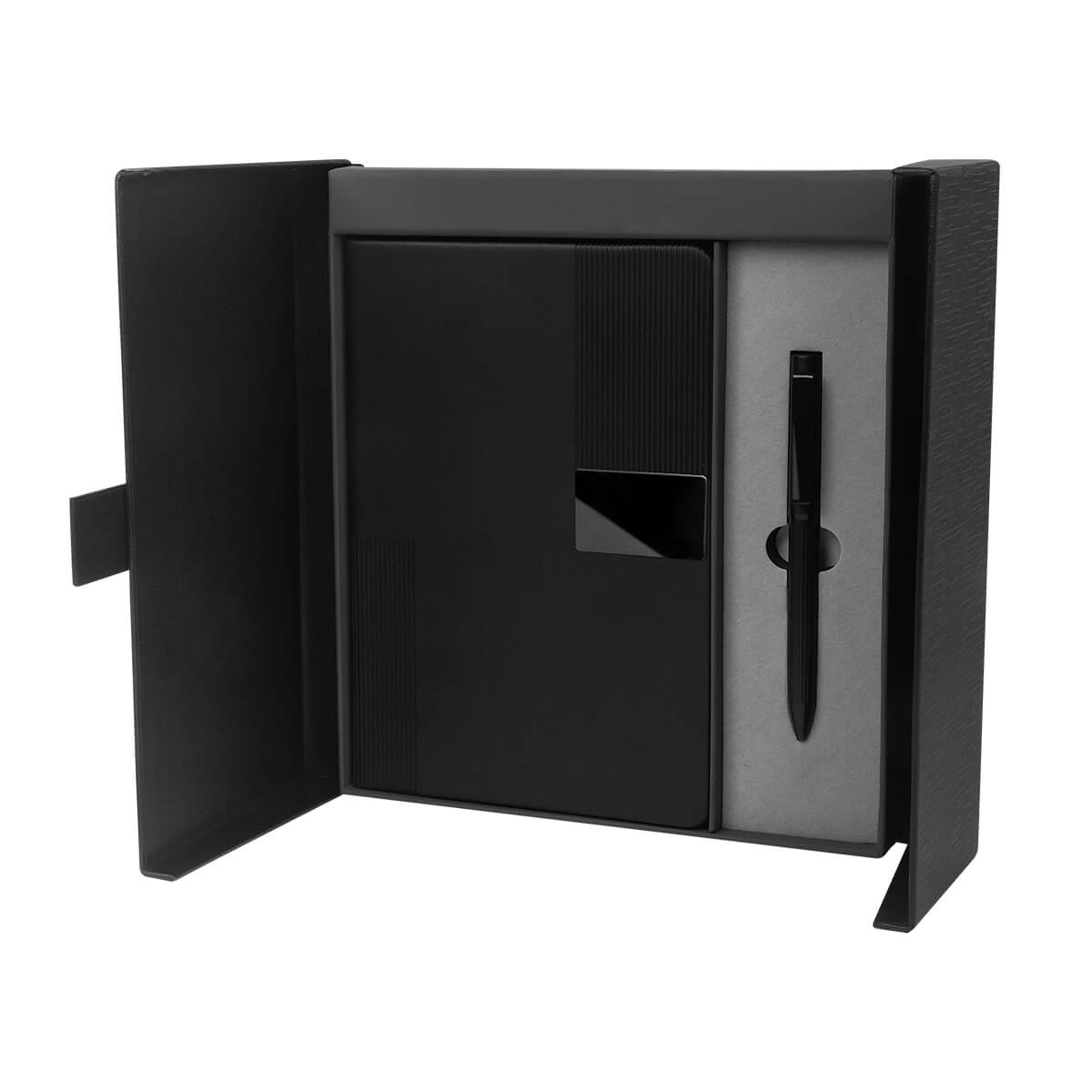 Con un diseño moderno y elegante, este set es ideal como regalo promocional de gran gusto, perfecto para obsequiar en fiestas de fin de año o fechas importantes, también puede utilizarse en campañas corporativas. Su color negro facilita el grabado de logotipos y diseños personalizados que destacarán la imagen de tu empresa.